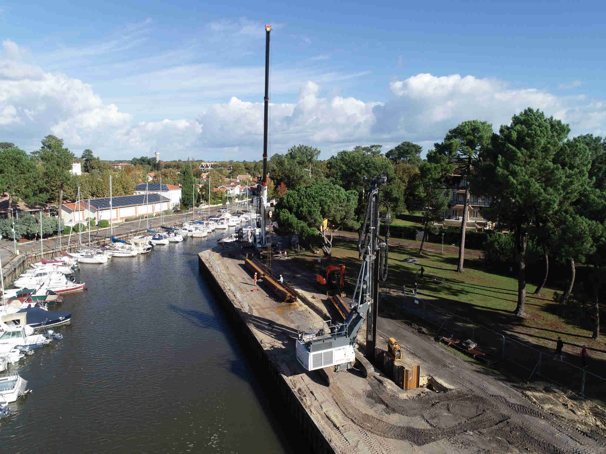 The new quay consists of sheet piles installed by vibratory driving and equipped with inclined bored tie rods. After backfilling, the concrete cap on the sheet piles and the pontoon guide rails are installed.