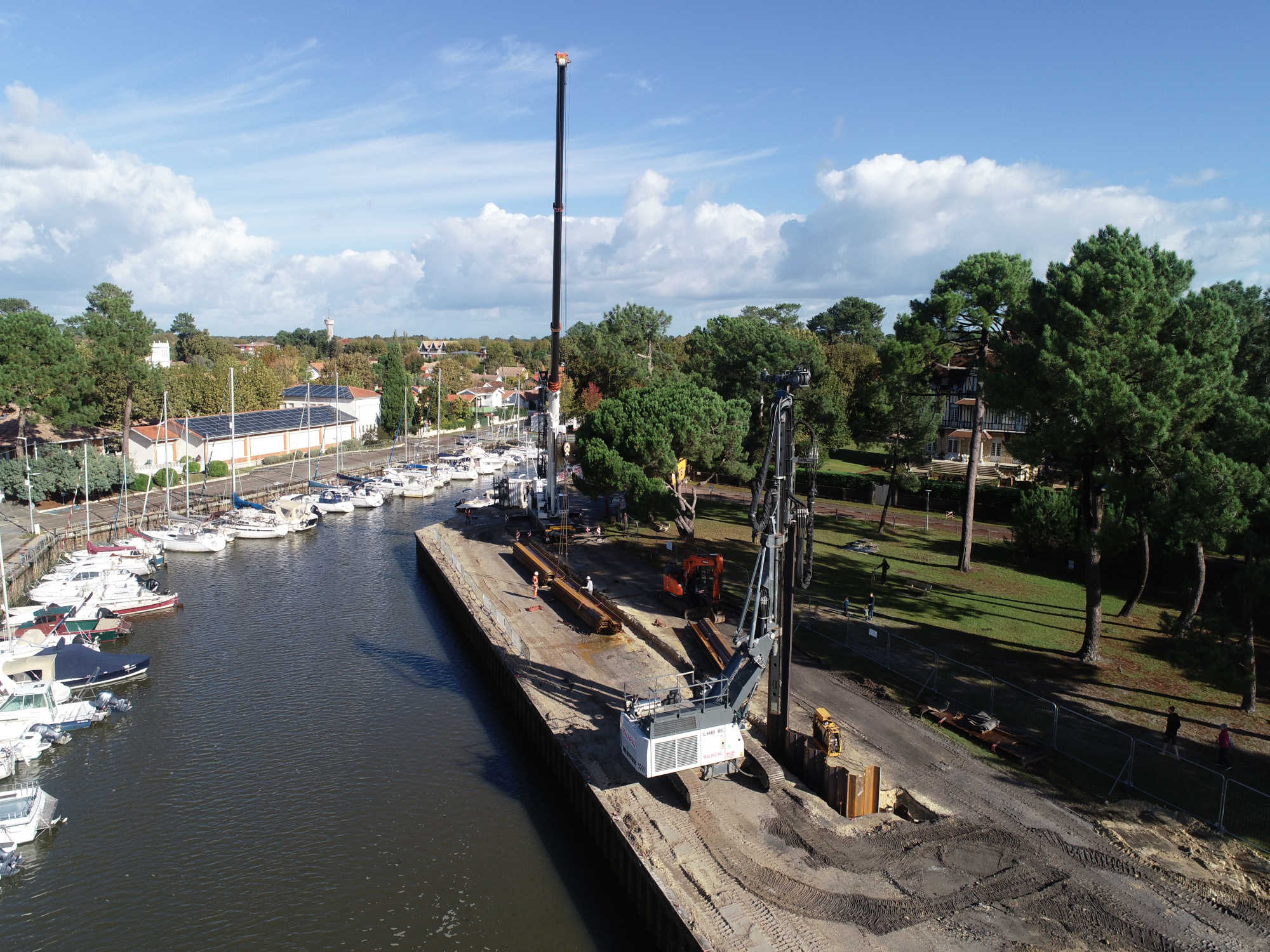 The new quay consists of sheet piles installed by vibratory driving and equipped with inclined bored tie rods. After backfilling, the concrete cap on the sheet piles and the pontoon guide rails are installed.